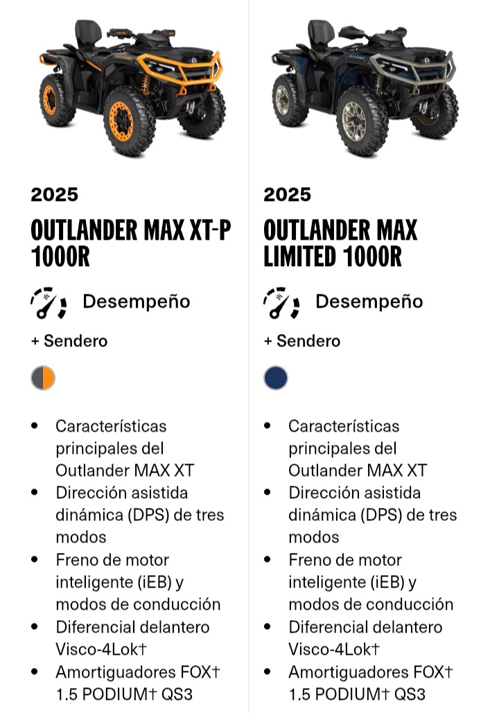 *Outlander MAX XT 700 2025* 🏍️- *Dirección asistida*: DPS de tres modos 🚗- *Freno de motor inteligente*: iEB 🔩- *Diferencial delantero*: De bloqueo automático QE Visco-Lok[15/9, 7:24 p. m.] Asistente para empresas: ¡Excelente selección de cuatrimotos Outlander! Aquí te presento un resumen de las características de cada modelo: